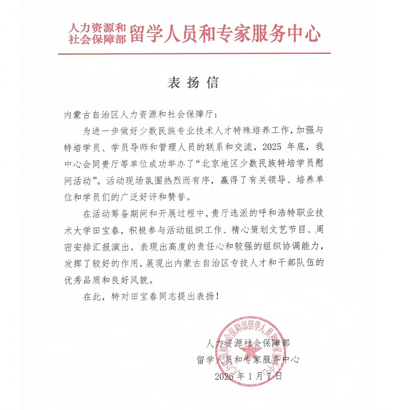 我校田宝春同志获人力资源和社会保障部留学人员和专家服务中心表扬