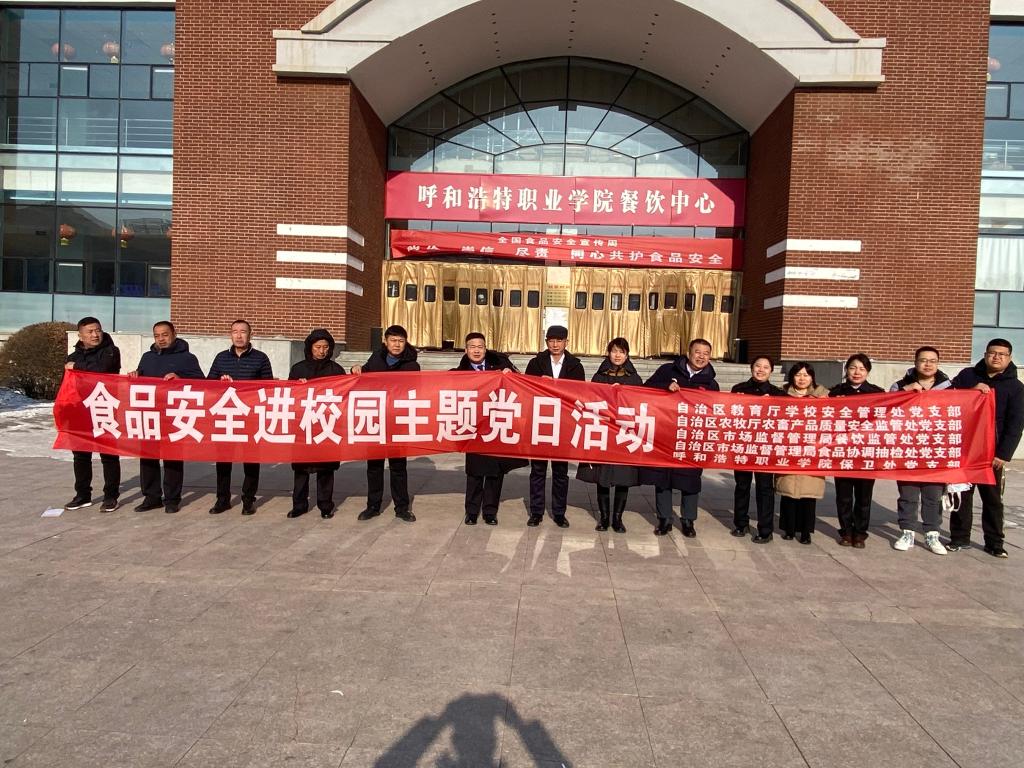 为进一步增强广大师生食品安全意识,保障广大师生饮食健康,2023年12月18日,自治区教育厅学校安全管理处党支部、自治区农牧厅农畜产品质量安全监管处党支部、自治区市场监督管理局餐饮监管处党支部、自治区市场监督管理局食品协调抽检处党支部、呼和浩特职业学院保卫处党支部在呼和浩特职业学院联合开展了食品安全进校园主题党日活动。此次活动共17人参加。