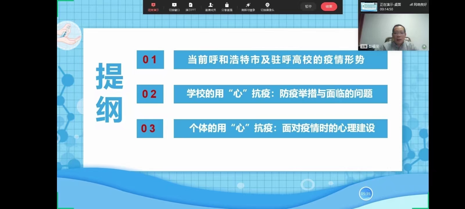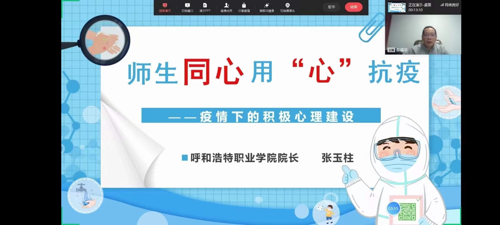 思政课围绕“师生同心 用‘心’抗疫——疫情下的积极心理建设”为主题,通过“当前呼和浩特市及驻呼高校的疫情形势”“学校的用‘心’抗疫:防疫举措与面临的问题”“个体的用‘心’抗疫:面对疫情时的心理建设”三个方面展开。