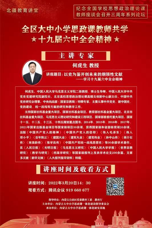 3月20日下午14:30,北疆教育讲堂举办“全区大中小学思政课教师共学十九届六中全会精神”线上讲座。根据自治区教育厅通知要求,请组织部、宣传统战部、学生工作处(武装部)、团委全体人员,马列部全体教师,各系(部)辅导员按时收看讲座。