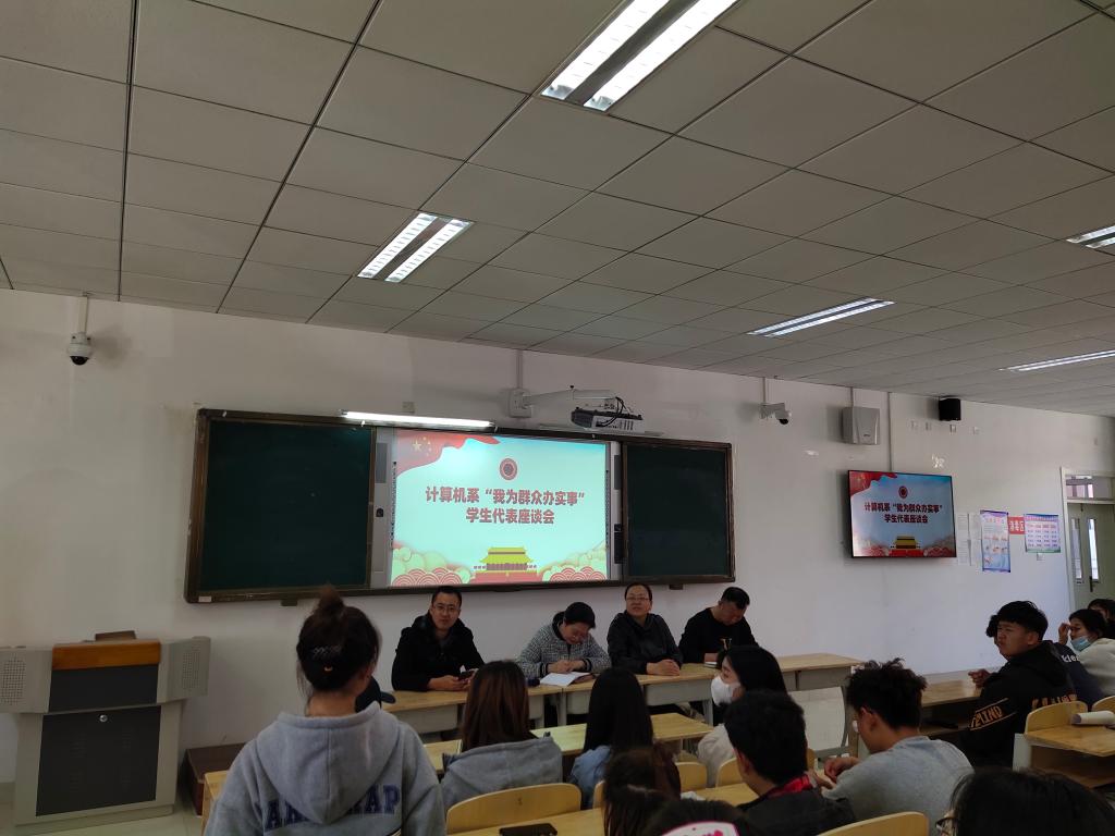 为进一步优化学生校园生活的质量,更好地践行为学生服务的宗旨,计算机系于2021年4月13日下午四点在四号教学楼201教室召开“我为群众办实事”学生代表座谈会,计算机系副主任杨丽、副主任王瑾瑜、学生科副科长高亮、学生科老师郑朴,全体学团干部及19、20各班代表参加本次座谈会。