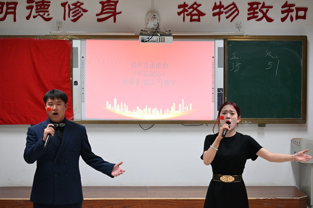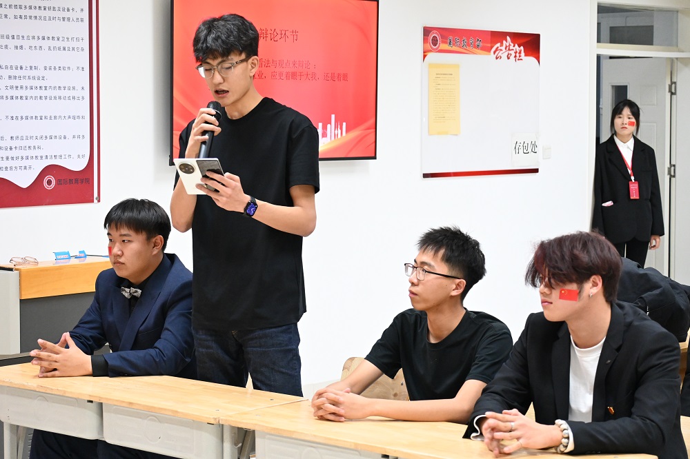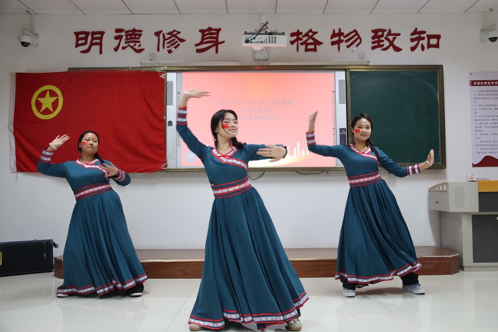 活动共分为两个篇章。第一篇章为青春·铸魂——深植国家情怀”,活动开始前,大家共唱团歌,主持人介绍了本次团日活动背景与意义,随后,文艺演出正式拉开序幕。悠扬的萨克斯演奏《牵丝戏》牵动我们心中共同的那份温柔与感动接着 DH舞社带来的蒙古族舞蹈《宴歌》随舞者的身影,奔赴一场草原的盛会,感受那份从心底涌出的、对生活最炽热的热爱第二篇章为团结·聚力——共绘民族同心圆”。精彩的“深植爱国情,知识伴我行”爱国知识问答环节点燃了现场气氛,青年踊跃抢答,在紧张活泼的节奏中巩固了国情党史、民族文化等知识,进一步激发了爱国热情。随后开展辩论赛活动,正反双方围绕“当代青年建功立业,更应着眼于大我还是小我这一经典而深刻的命题,为我们展现了精彩的思辨与激荡。主持人总结指出,“大我”与“小我”并非对立,而是相辅相成,鼓励青年在实现自我价值的同时,更要心怀“国之大者”,实现个人成长与国家发展的同频共振。活动在一曲《不忘初心》中圆满结束,团总支副书记范冰冰带领全体同学重温入团誓词,进一步坚定了理想信念