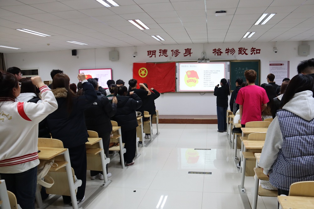 活动在庄严的团歌声中拉开序幕,主持人韩涵、尤思涵围绕“十五五”规划的战略意义与雷锋精神的时代价值展开主题导入,通过播放雷锋事迹主题短片,带领同学们重温榜样力量。随后,两名同学结合自身经历,分享了寒假期间参与“返家乡”社会实践活动的感悟与收获,展现了青年学子在基层服务中践行雷锋精神的生动实践。在互动环节中,“雷锋知识快问快答”与“雷锋行为判断”两个趣味游戏充分调动了现场气氛,同学们在轻松活跃的氛围中深化了对雷锋精神内涵的理解,进一步明确了将奉献精神融入日常行动的方向。活动尾声,全体团员面向团旗重温入团誓词,铿锵誓言展现了新时代青年坚定信念、勇担使命的精神风貌。