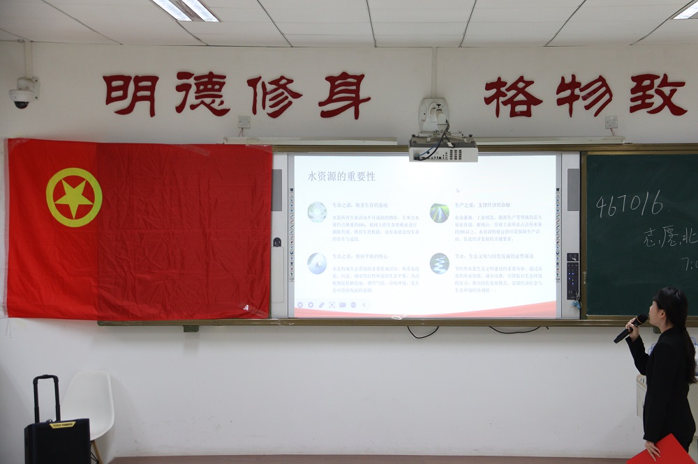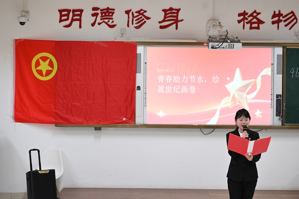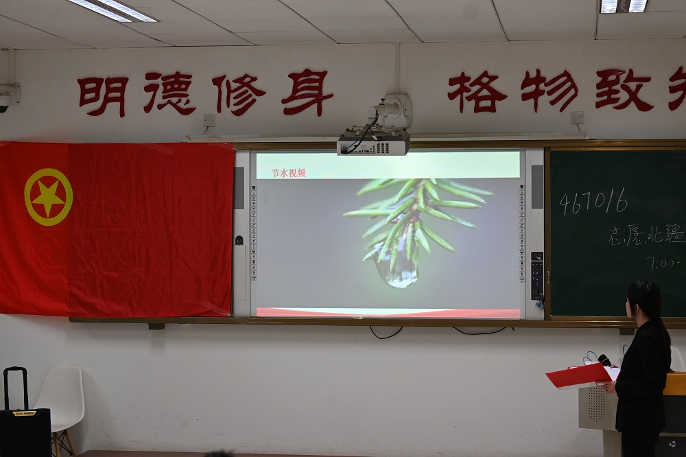 活动在庄严的团歌声中正式拉开帷幕,主持人首先从生命基础、经济命脉、生态核心三个维度深入阐释了水资源的重要意义,强调水是维系人类生存与发展的根本资源,并指出节约用水不仅是个人美德,更是推进生态文明建设、实现可持续发展的必然要求。在接下来的节水知识快问快答环节中,同学们积极踊跃,围绕洗手、洗漱、洗衣、厕所节水等日常生活中的常见场景展开激烈抢答,现场互动轻松而热烈,大家在欢声笑语中掌握了许多实用且易行的节水小技巧,进一步提升了环保意识。随后,全体同学共同观看了一部节水主题宣传教育视频,镜头中展现的全球水资源分布、干旱地区景象以及水污染现状等珍贵影像,深深触动了在场每一个人,使大家深刻感受到每一滴清水的来之不易与保护水资源的紧迫性。活动最后,团总支副书记范冰冰带领全体同学一起重温入团誓词,铿锵有力的誓言再次坚定了大家践行绿色生活、担当青年使命的决心。