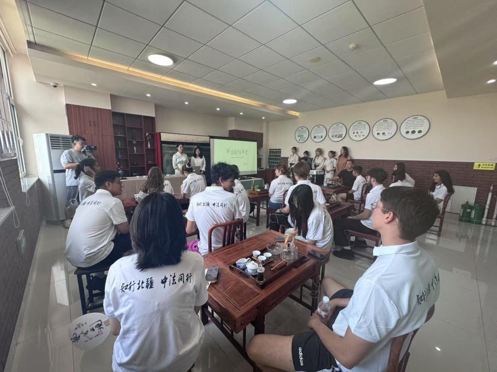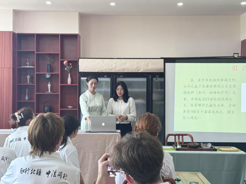 校园参观及交流结束后,在内蒙古工业大学国际教育学院、呼和浩特职业技术大学国际教育部、人文与旅游系和美术系教师及志愿者的陪同下,法国学生参与了两项具有代表性的非遗文化体验项目。在茶艺体验环节,人文与旅游系李素芬、兰江宇两位教师不仅系统的演示了中国传统茶艺的完整流程,更着重阐释了其中蕴含的传统文化理念。学生们通过亲身参与茶叶品鉴与冲泡实践,深刻体会到中国茶文化的精神内涵。