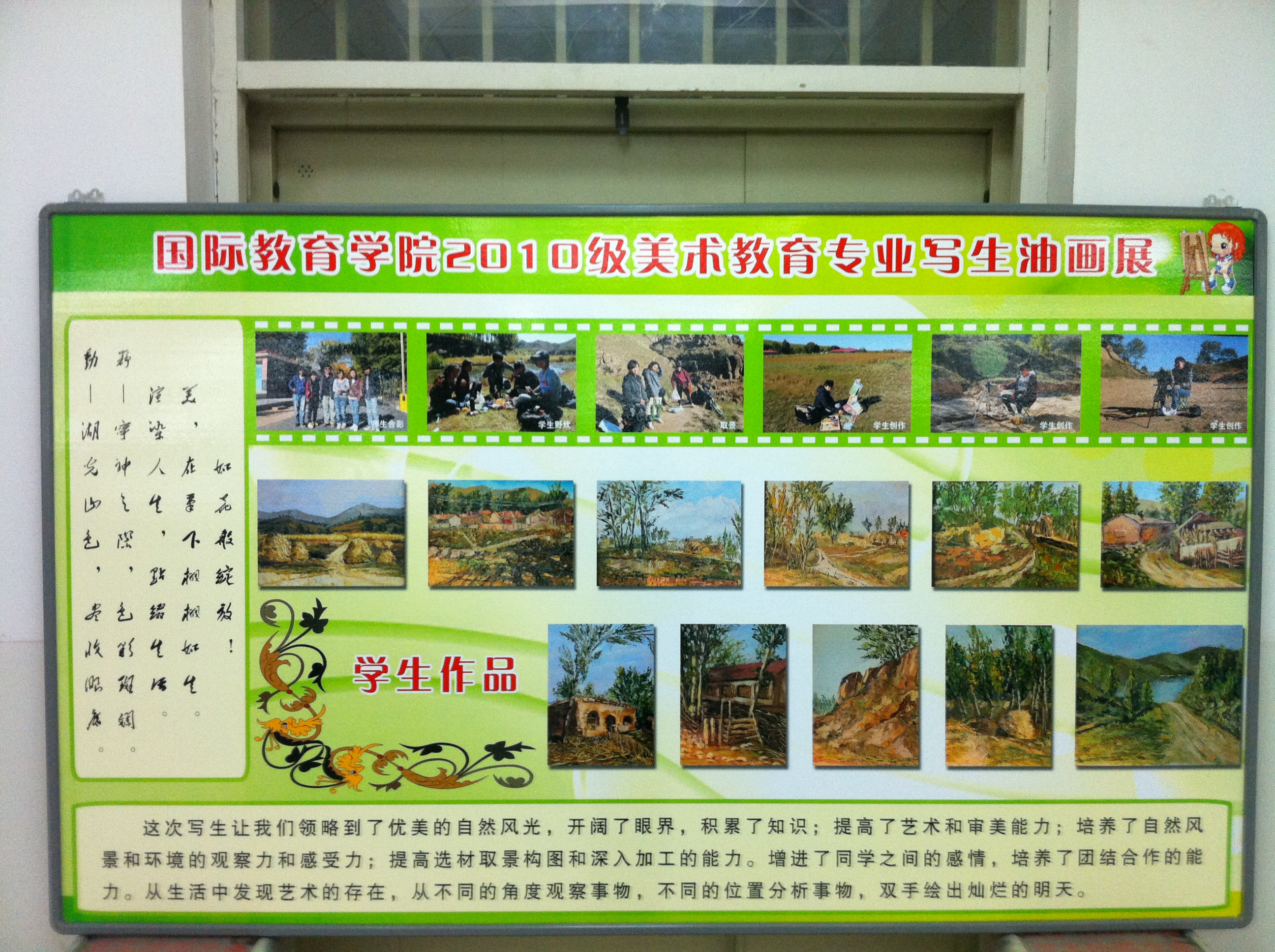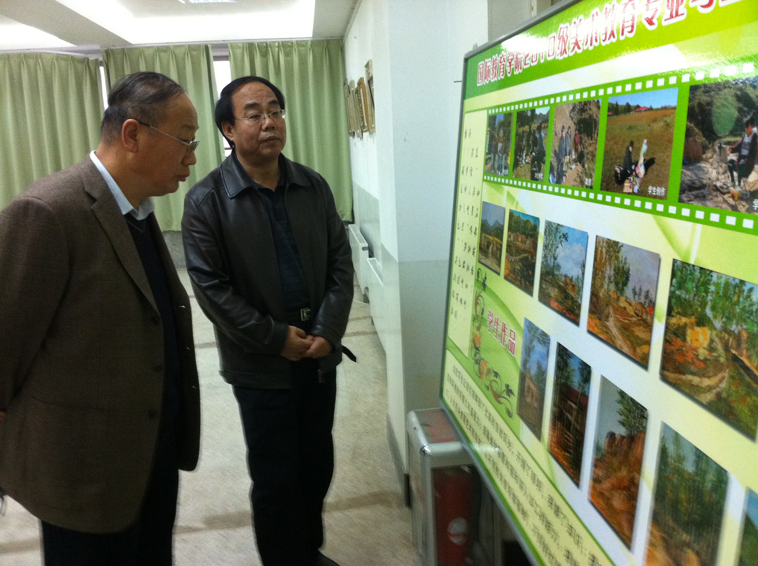 近日,由国际教育学院主办的“国际教育学院2010级美术教育专业永兴湖秋季写生美术作品展”在主教学楼六楼展厅进行展览。呼和浩特职业学院贾润副院长观看了此次展览,国际教育学院党总支王颖书记,董方生院长,谢长霞副院长等参加了展览。