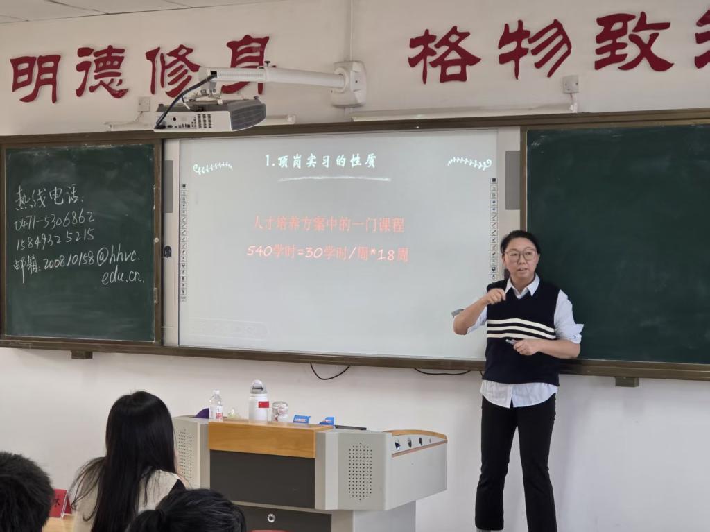 随后,会议进入政策解读与任务部署环节。张越副主任强调了学校对岗位实习工作的部署要求,领学了学校岗位实习工作管理制度,明确了实习制度要求与工作规范。封祺副主任传达了国际教育部岗位实习安全管理制度,筑牢实习安全防线。各教研室主任及专业教师结合不同专业人才培养目标,分领域详解了实习任务、核心内容、能力要求及考核标准。实习实训中心主任公布了国际教育部实习问题反映渠道,保障及时响应学生实习诉求,并围绕实习总体时间安排、实习材料提交及实习管理平台操作流程进行讲解,现场解答学生疑问,保障明确实习具体要求。