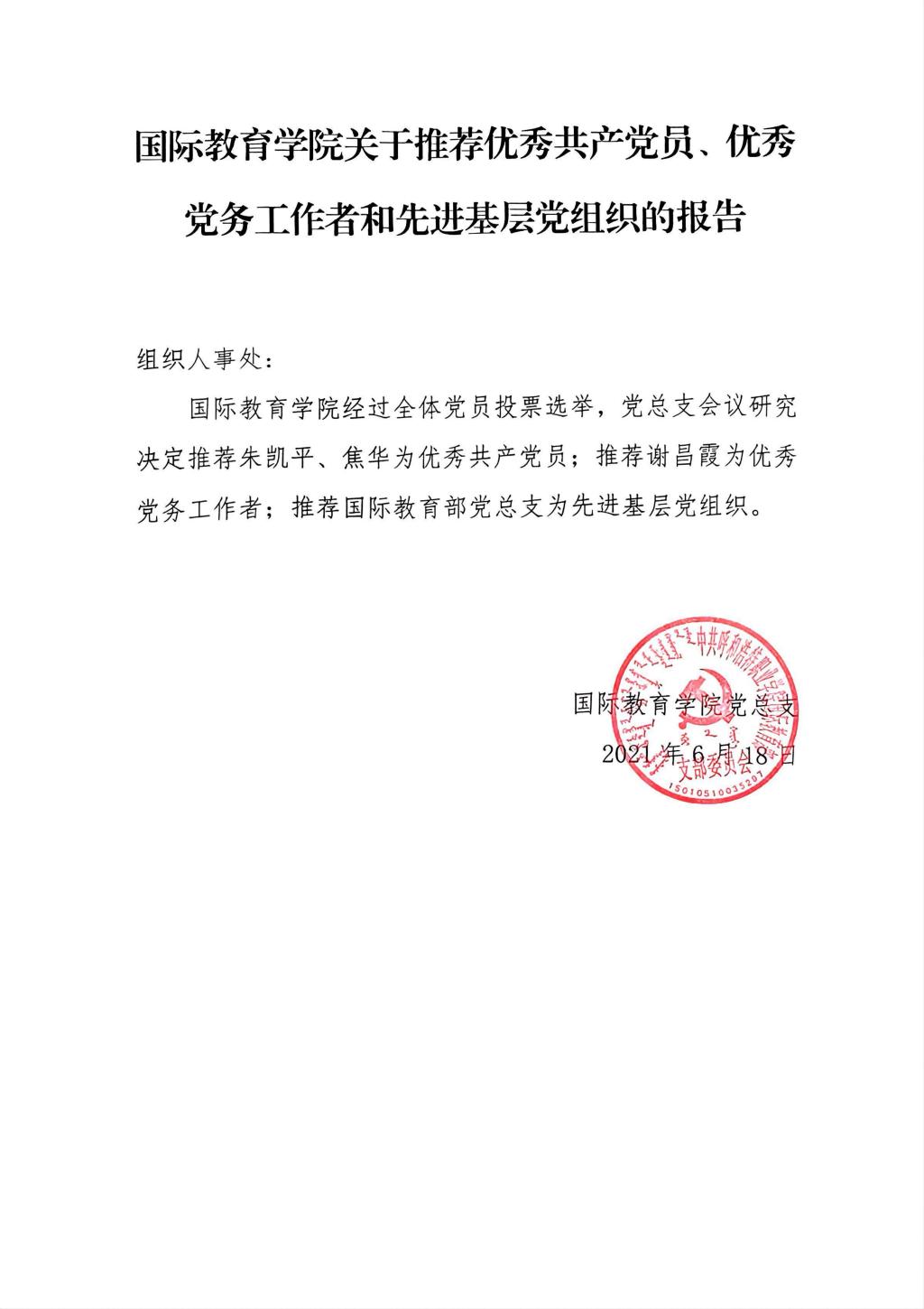 2021年国际教育部优秀党员、优秀党务工作者和先进基层党组织的报告