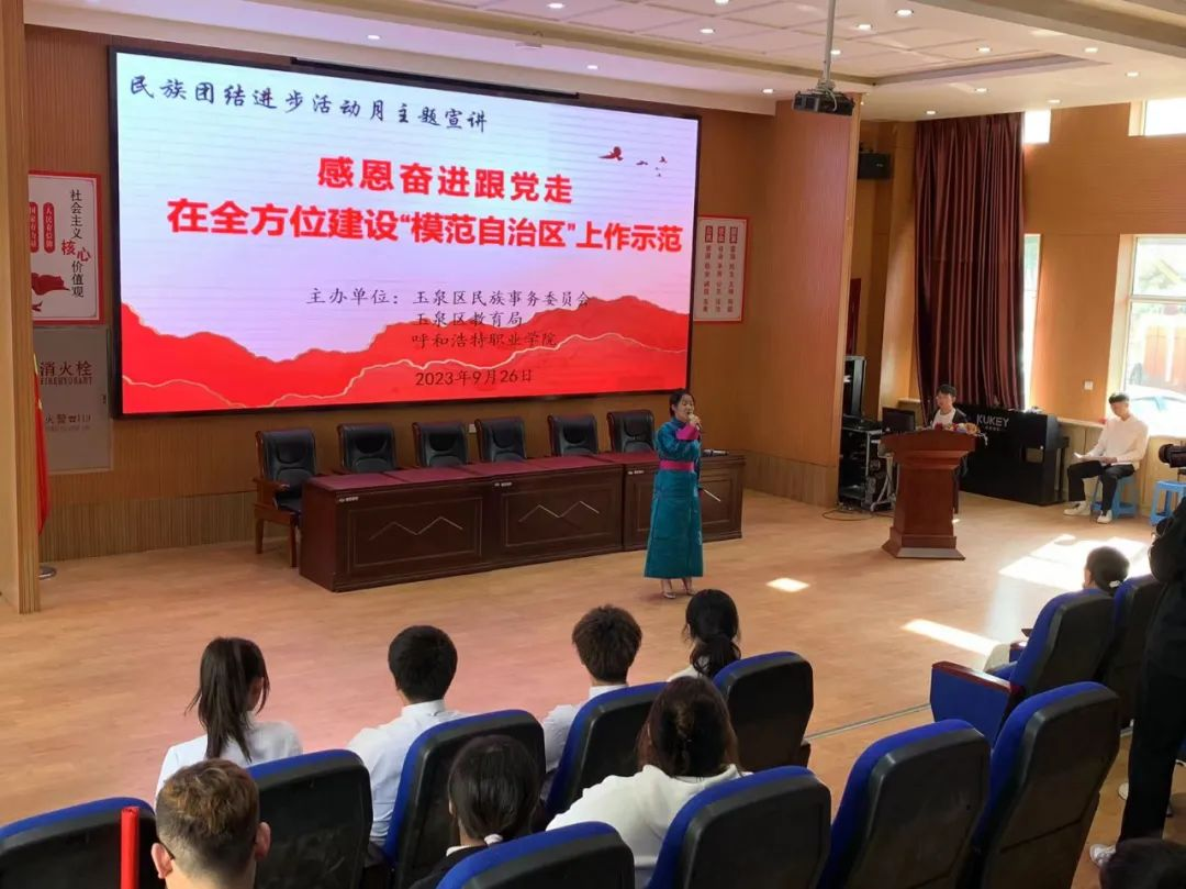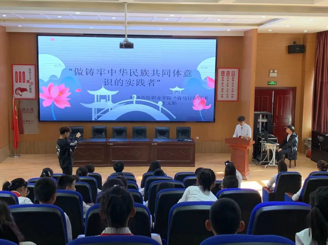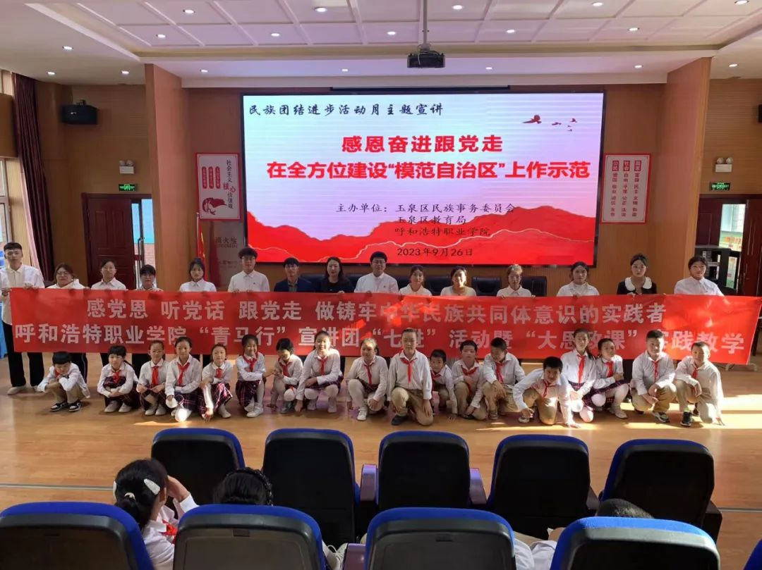 为深入贯彻落实习近平总书记关于加强和改进民族工作的重要思想和大思政课要善用之的教育思想,推进学院“大思政课”建设,9月26日,国家民委中华民族共同体研究基地呼和浩特市分基地、呼和浩特职业学院马克思主义教研部、内蒙古自治区高校思政工作“李艳芬名师工作室”与玉泉区民委、玉泉区教育局开展“民族团结进步活动月”联学共建主题宣讲会暨学院“大思政课”实践教学。本次宣讲会暨大思政课实践教学以“感恩奋进跟党走,在全方位建设模范自治区上作示范”为主题,由“李艳芬名师工作室”成员、学院“青马行”宣讲团成员深入恒昌店巷小学(五里营校区)以“进校园”形式进行。