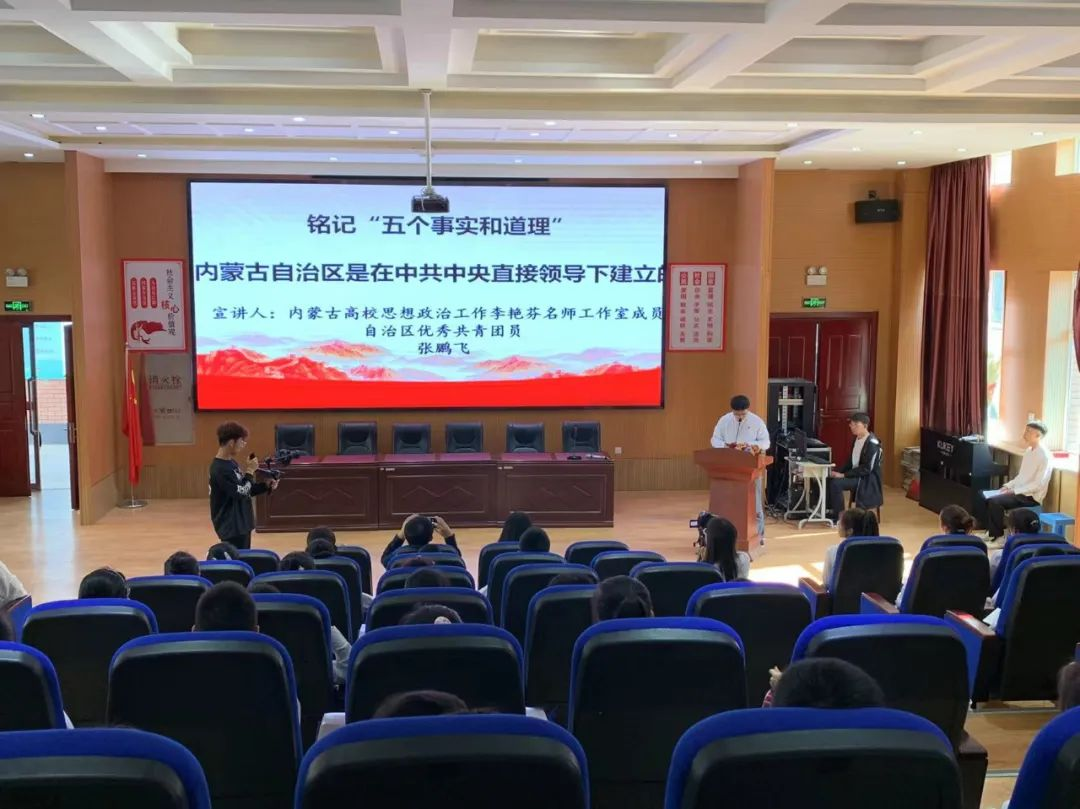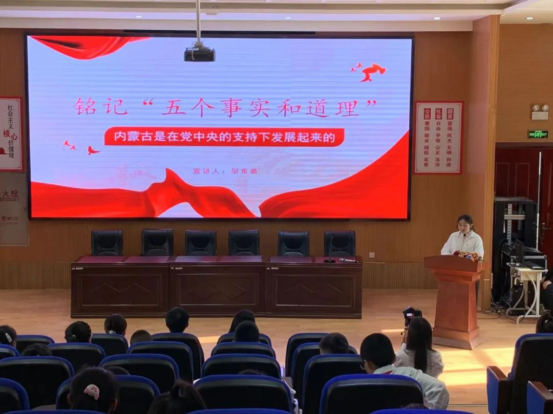 “青马行”宣讲团以一首《站在草原上望北京》开启了本次主题宣讲进校园的序幕,表达了内蒙古各族人民对党和国家崇高的挚爱之情。接着宣讲员们紧紧围绕“内蒙古地区是中国共产党最早建立党组织的民族地区、内蒙古自治区是在中共中央直接领导下建立的、内蒙古是在党中央的支持下发展起来的、内蒙古工作中出现的重大偏差都是党中央帮助纠正的、内蒙古作为模范自治区模范就模范在听党的话上”的“五句话的事实和道理”开展深入浅出地宣讲。宣讲员们史论结合、论丛史处讲解了在中国共产党的领导下,内蒙古各族人民共同团结奋斗、共同繁荣发展的光辉历程,阐释内蒙古民族工作所取得的发展和历史成就都是在党中央的支持下取得的,宣讲了习近平总书记和党中央对内蒙古的关怀与支持,宣讲内容丰富,理论指导性强,激发了广大师生对中华民族共同体意识、民族团结进步理论知识学习的认同。