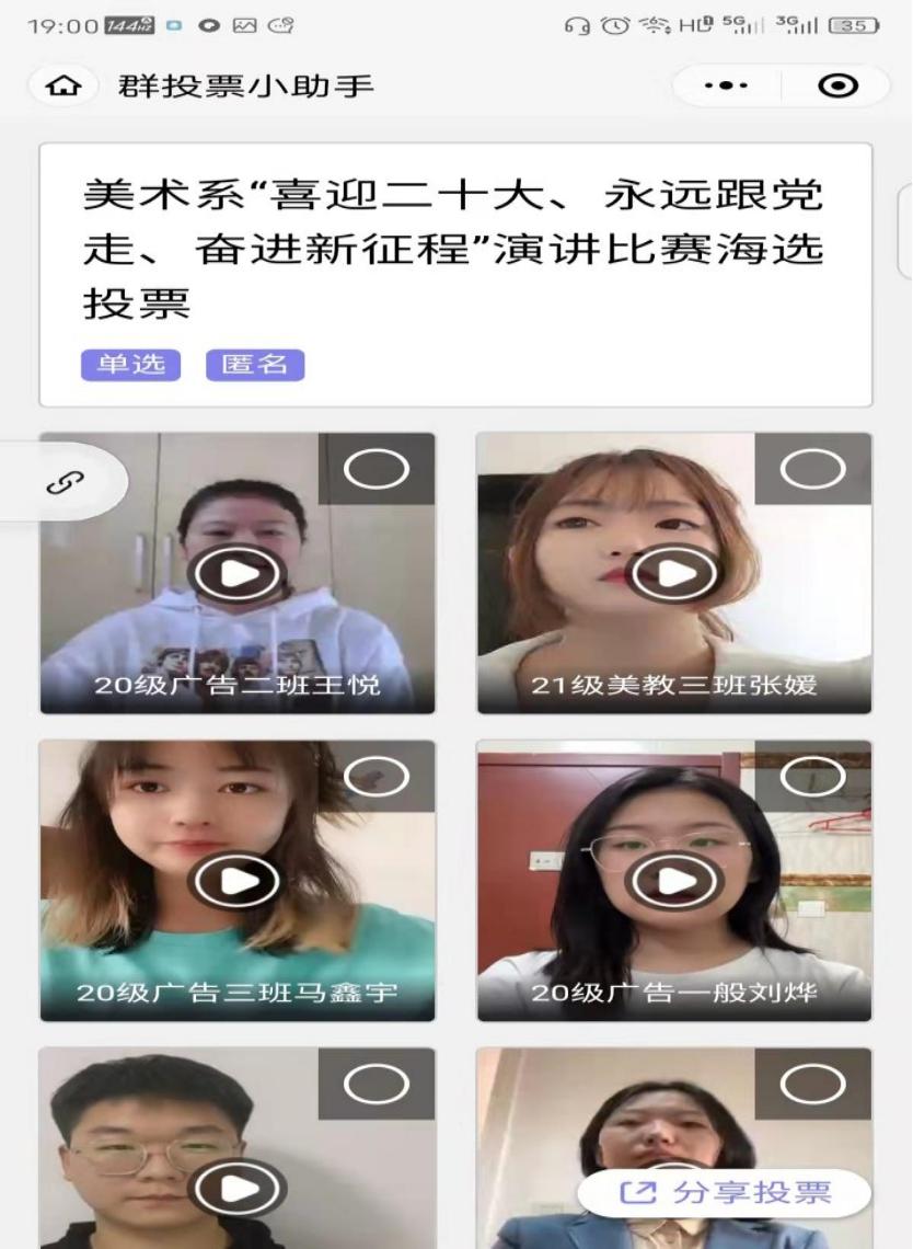 为了深化学习习近平新时代中国特色社会主义思想,全面落实习近平总书记关于加强和改进民族工作的重要思想和对内蒙古重要讲话重要指示批示精神,美术系于2022年4月8日至4月10日举办了“喜迎二十大、永远跟党走、奋进新征程”--铸牢中华民族共同体意识线上演讲比赛活动。本次活动由部分选手参加,党支部书记娜日苏、张晗副主任带领美术系全体师生进行投票。