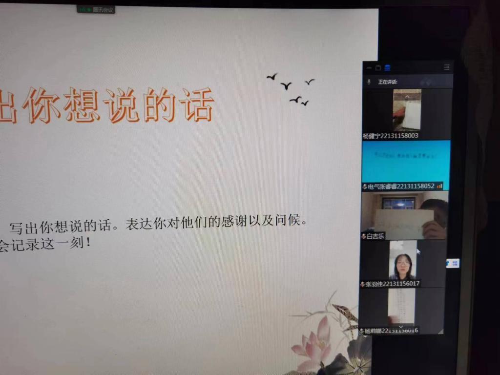 本次活动以线上方式展开。活动中,王一凡、李爽和谢妍同学通过演讲的方式,向大家介绍了杨振宁、苏炳添、朱彦夫等为我国建设事业发展有突出贡献的各行各业的代表人物。这些人物的朴实无华,淡泊名利,艰难执著,自强自立的生命历程让大家深受鼓舞。活动最后,同学们纷纷拿起手中的纸和笔,书写下他们心中最感动的人,让同学们更加深刻理解了感恩的重要涵义。