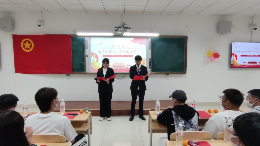 为全面贯彻国家语言文字方针政策和法律法规,进一步提升大学生的语言文字规范化和普通话应用水平,营造良好的规范用语用字氛围,计算机系团总支于2022年9月20日晚组织开展“推广普通话,喜迎二十大”主题团日活动。计算机系学团科副科长兼团总支书记张书恒、20级全体学团干部、21级、22级部分同学参加了本次活动。