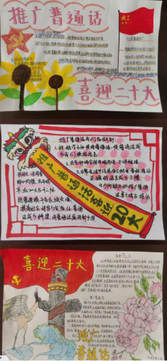 “书同文、语同音、人同心”。各班开展以“推广普通话,喜迎二十大”为主题的团日活动,包括“介绍2022年推普周的相关知识”“推广普通话的意义”“普通话的知识”、绘制手抄报和黑板报等内容,同学们深刻地认识到了统一使用普通话和规范汉字带来的方便和好处。倡导大家从自身做起,从点滴做起,带动身边的人一起讲普通话。