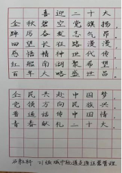 “三字一话” 比赛分为粉笔字、钢笔字、毛笔字,均采取提交作品的形式进行。活动期间同学们积极参与,钢笔字书写者们握笔有力,在方格中尽显硬笔书法的豪气,呼应喜迎二十大的主题,激励我们奋发图强,共绘中国梦。毛笔字书写者以楷书书写,丰腴雄浑。在书写中阐释书法的的精神,传承文化魅力。粉笔字书写者留下的粉笔字迹潇洒飘逸,尽显粉笔字的魅力。