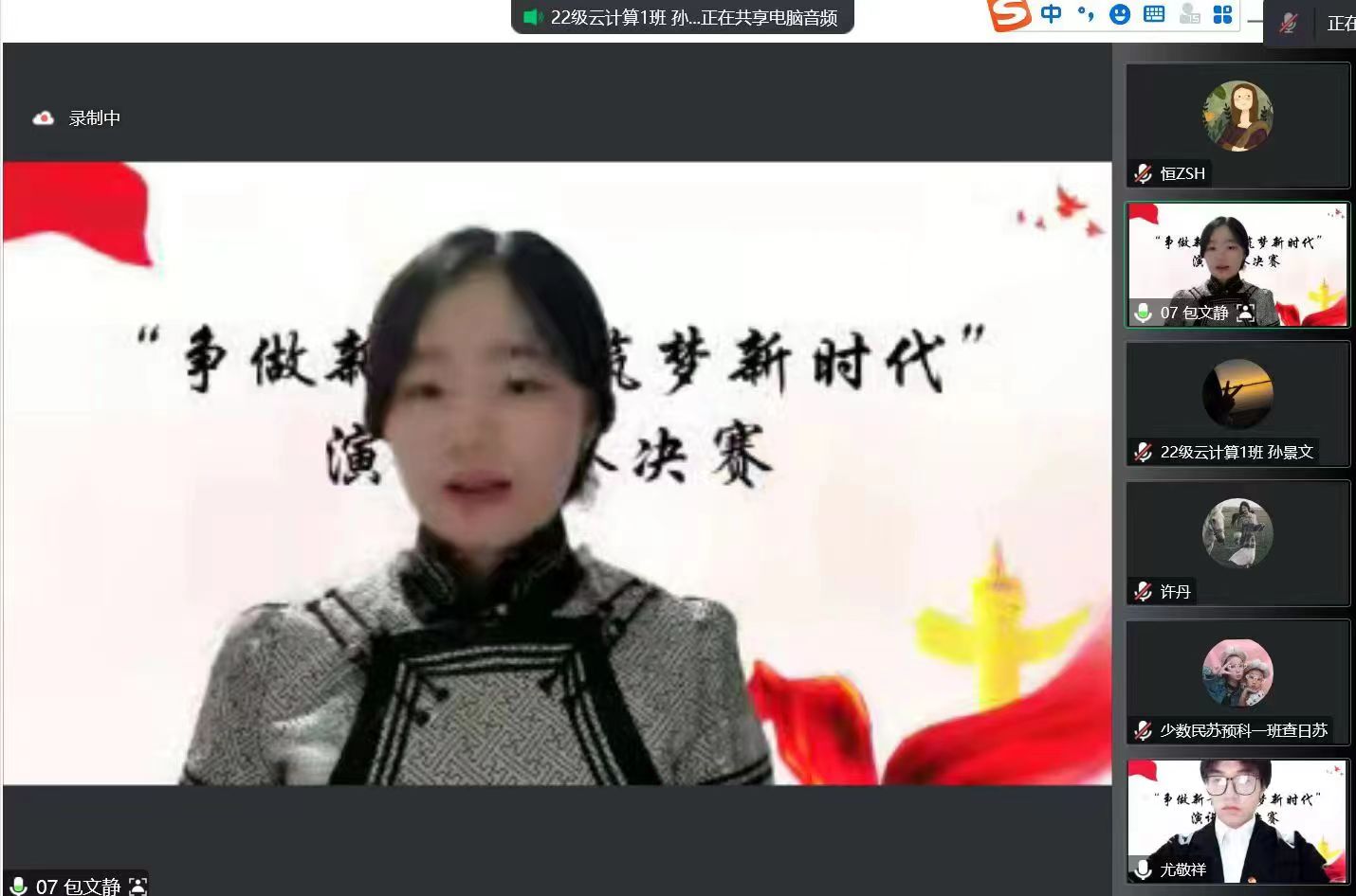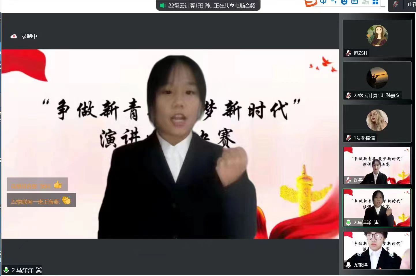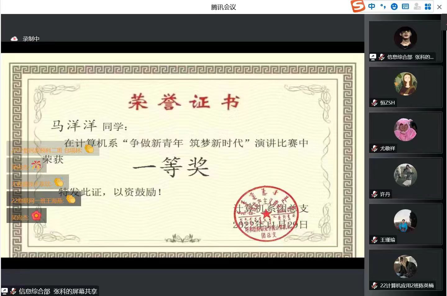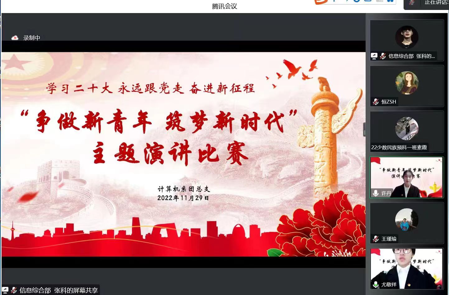 为深入学习贯彻党的二十大精神,厚植青年学生的爱党、爱国、爱社会主义情感,计算机系团总支于2022年11月29日晚7点在腾讯会议开展“学习二十大、永远跟党走、奋进新征程”——“争做新青年、筑梦新时代”演讲比赛。计算机系副主任王瑾瑜、学团科副科长兼团总支书记张书恒等担任本次比赛的评委。