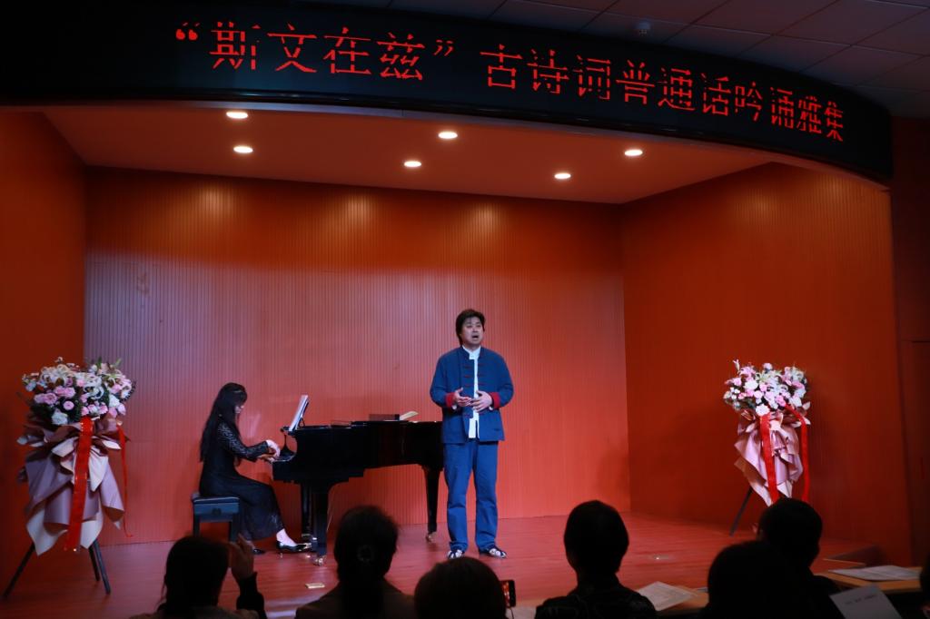 14位吟诵者吟唱《诗经·采薇》的“昔我往矣,杨柳依依”,李白的“举头望明月,低头思故乡”,高适的“莫愁前路无知己,天下谁人不识君”,辛弃疾的“稻花香里说丰年,听取蛙声一片”……师生在23首古诗词的吟诵中穿越时空,与圣贤对话,感受他们的喜怒哀乐。项目组负责人王浩东老师吟诵的自创绝句《望远》和《春雪》,亦充分展示了古诗词普通话吟诵的艺术魅力。项目组从技巧研究的角度,结合专业优势,把音乐创作和声乐唱法融入到诗词吟诵中,形成了自己独特的吟诵及吟诵调创作风格,初步形成了古诗词普通话吟诵唱法。为了达到更好的传播效果,贴近现代人的审美,项目组大胆尝试用钢琴伴奏。本次活动中,钢琴伴奏由师范部胡雪梅老师担任。