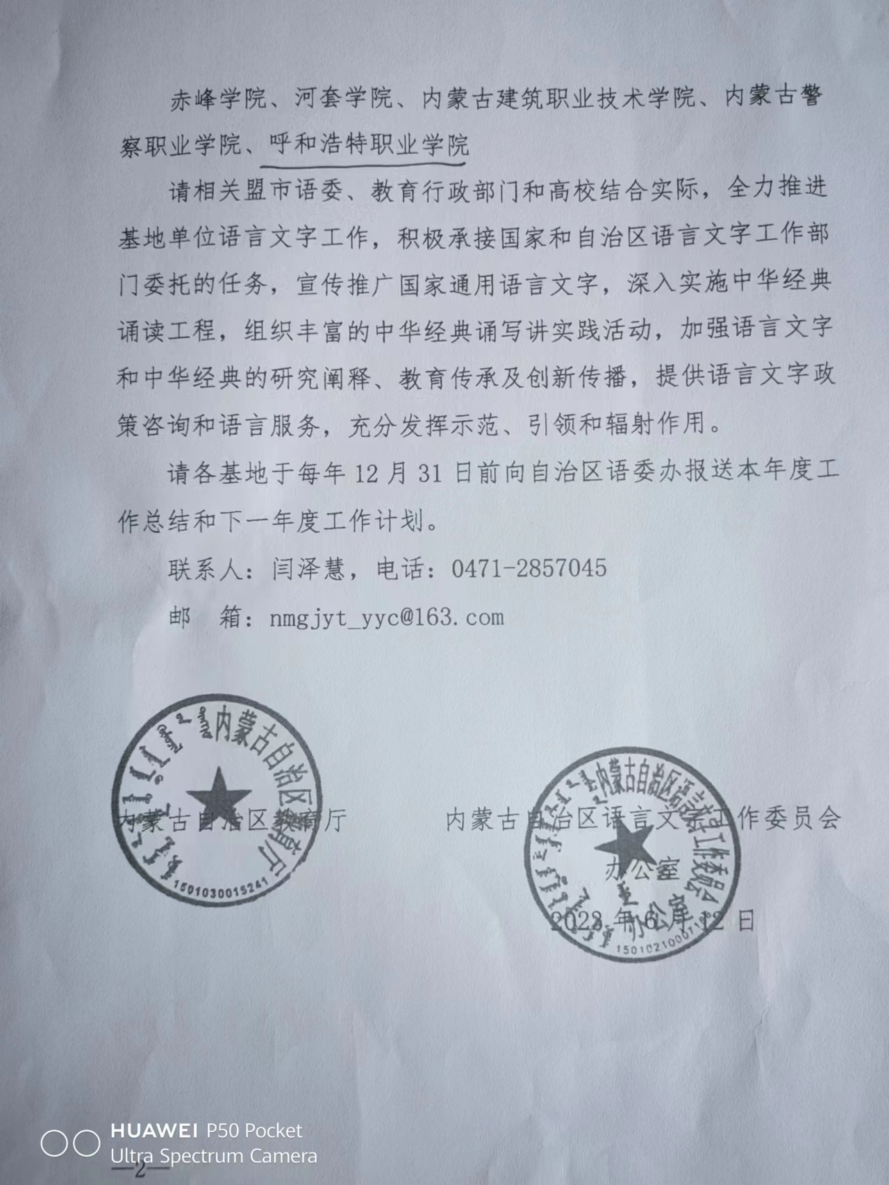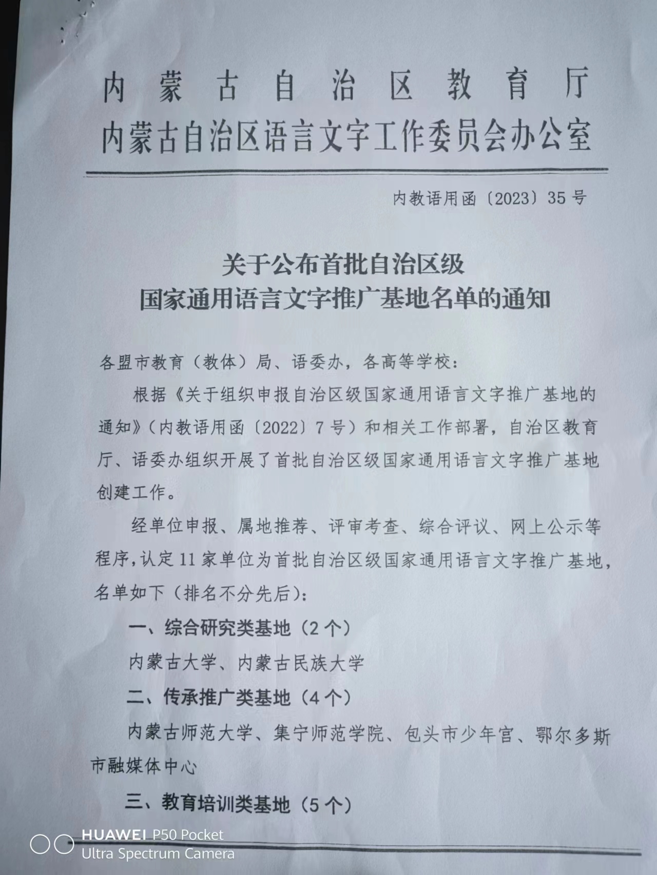 6月12日,自治区教育厅、自治区语言文字工作委员会公布了首批自治区级国家通用语言文字推广基地名单,呼和浩特职业学院入选自治区国家通用语言文字“教育培训类基地”。
