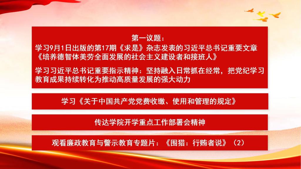 为提高第一议题意识,全体党员学习了9月1日出版的第17期《求是》杂志发表的习近平总书记重要文章《培养德智体美劳全面发展的社会主义建设者和接班人》和习近平总书记重要指示精神:坚持融入日常抓在经常,把党纪学习教育成果持续转化为推动高质量发展的强大动力。后勤管理处全体党员干部要发挥先锋模范作用,把培养社会主义建设者和接班人的责任落实到实际工作中,发挥好后勤服务育人环境育人功能。要把纪律教育融入党员干部日常教育监督管理,推动纪律教育常态化长效化,牢牢守住“两个风险”底线。
