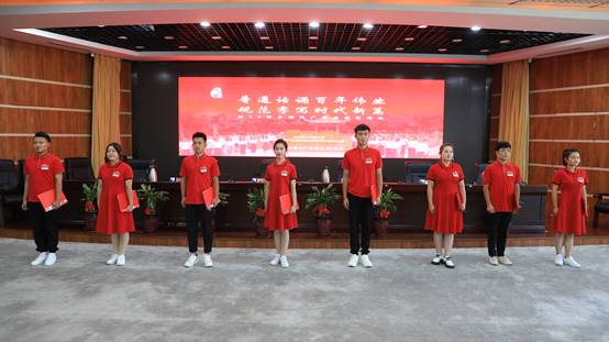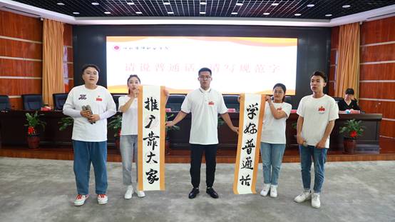 9月16日下午,学院在明德楼一号会议室举办2021年推广普通话宣传周启动仪式,学院党委副书记、院长张玉柱,党委委员、副院长贾润,党委委员、纪委书记田文阁,党委委员、党政办公室主任张瑞斌、宣传统战部负责人刘惠华、人事处处长冀文军,语委会办公室全体成员,各系(部)党总支书记、分管学生工作副主任、团总支书记,各行政处室、系(部)办公室主任、信息员、经常负责文字写作的工作人员和团学干部代表共100余人参加了启动仪式。