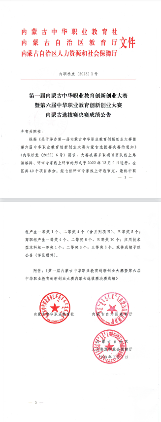 本次大赛以“职教育工匠,双创筑梦想”为主题,由内蒙古中华职业教育社、教育厅、人力资源和社会保障厅共同主办,本次内蒙古赛区选拔赛通过采用专家线上集中评审,现场打分,项目团队按照抽签顺序依次进行在线路演答辩的方式参赛,最终评选出本次大赛的各个奖项。