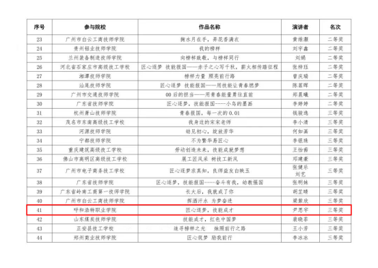 在此次“匠心逐梦 技能报国”比赛中,我院学子积极参与,生动阐述了对学习匠心逐梦、技能报国的理解,表达了积极践行工匠精神的信心和决心。学院高度重视备赛工作,从演讲选手选拔、演讲稿撰写、体态及语言训练到演讲视频拍摄都进行了充分准备。下一步,学院将不断推进“三全育人”工作,为学生搭建更多锤炼专业本领、勇攀技能高峰、展现青春活力的展示平台,以呼职技能青年之名,用实际行动践行工匠精神!