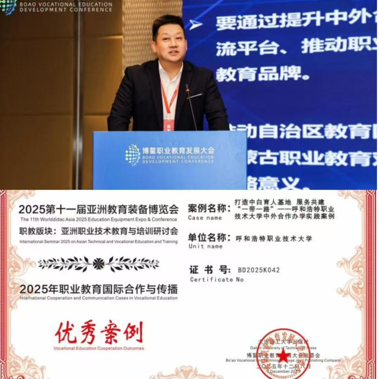 为深化职业教育国际合作,推动产教融合高质量发展,12月5日至8日,2025首届博鳌职业教育发展大会在海南博鳌亚洲论坛国际会议中心召开。来自全球20多个国家及地区的近400所院校、60余家企业、200余支参赛队伍及2000余名代表参加大会,围绕职业教育全球化发展与深化产教融合等核心议题展开深入交流与务实对接。会上,学校荣获“职业教育对外交流与合作典型院校”奖及“大会卓越组织单位”奖;我校中外合作办学成果案例被评为2025职业教育国际合作与传播优秀案例。