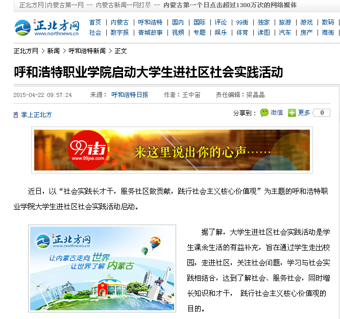 正北方网:呼和浩特职业学院启动大学生进社区社会实践活动