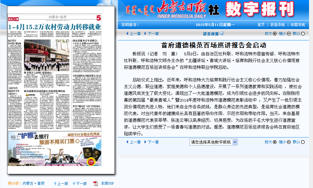 呼和浩特日报:培育和践行社会主义核心价值观道德人物百场巡讲报告会启动
