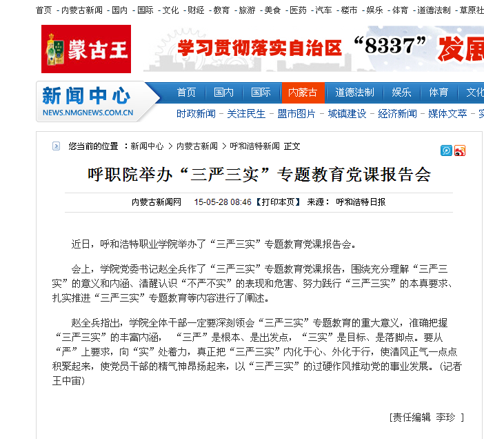 内蒙古新闻网:呼职院举办“三严三实”专题教育党课报告会