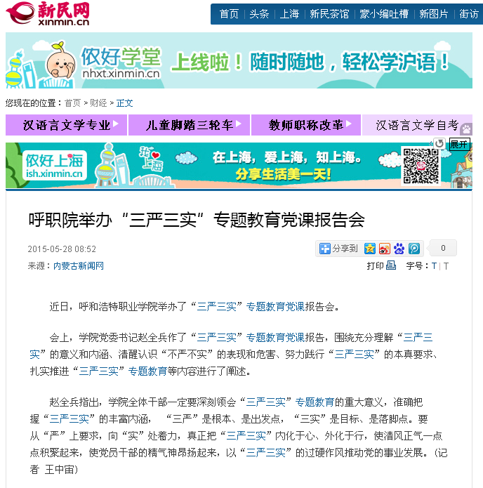 新民网:呼职院举办“三严三实”专题教育党课报告会