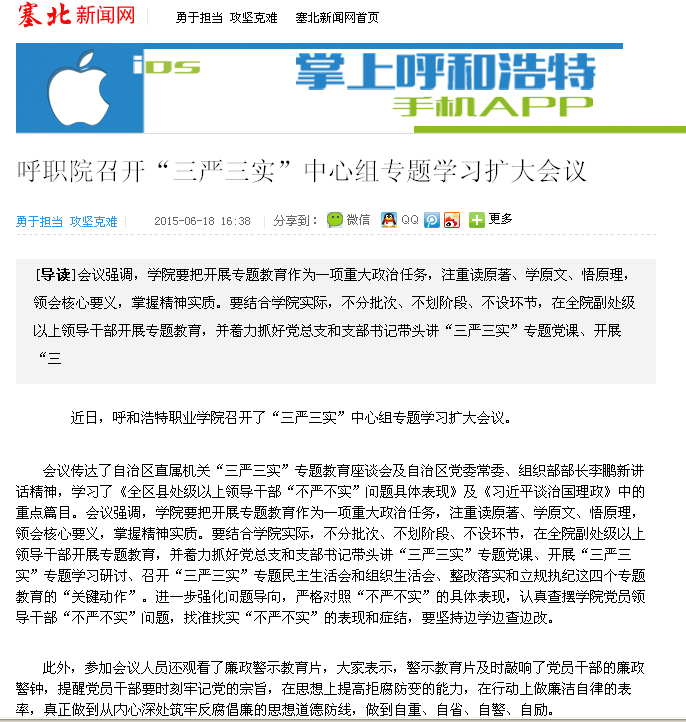 塞北新闻网:呼职院召开“三严三实”中心组专题学习扩大会议
