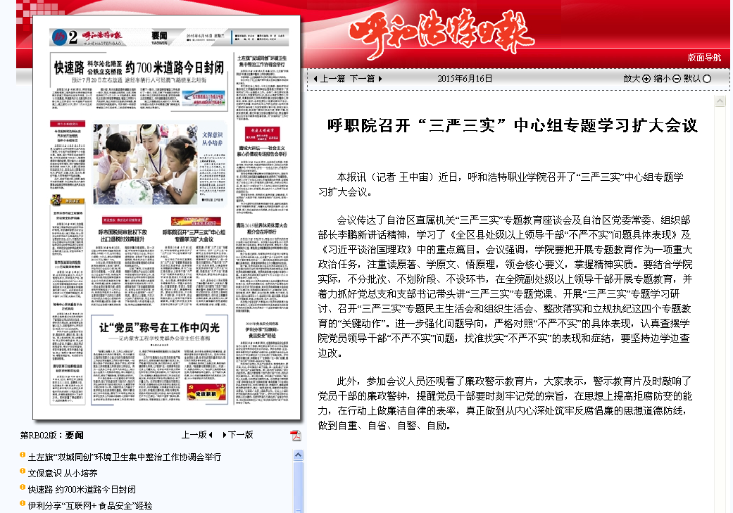 呼和浩特日报:呼职院召开“三严三实”中心组专题学习扩大会议