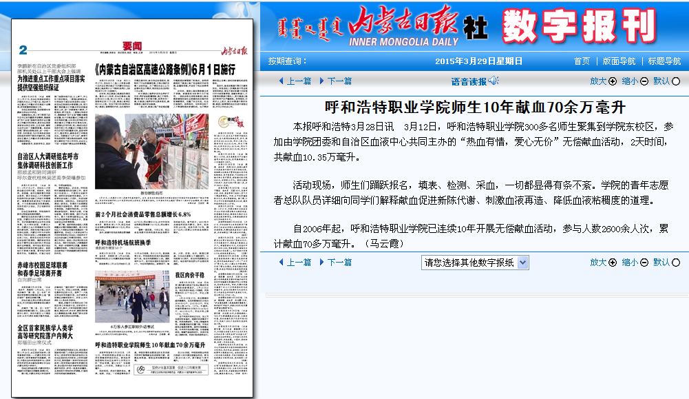 内蒙古日报:呼和浩特职业学院师生10年献血70余万毫升