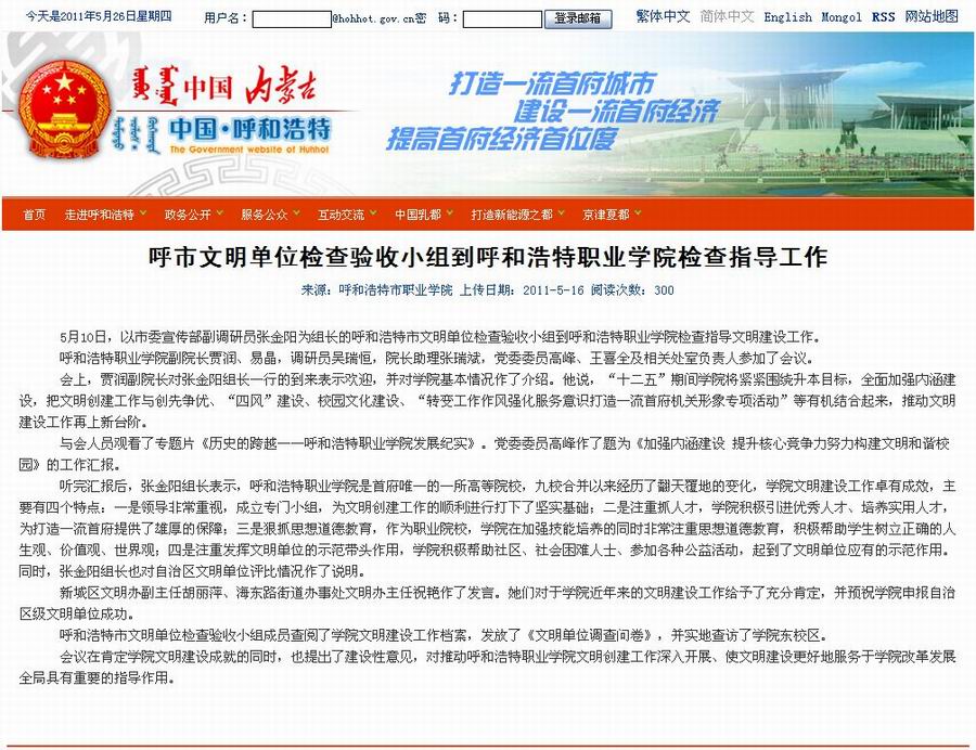 呼和浩特政府网:呼市文明单位检查验收小组到呼和浩特职业学院检查指导工作