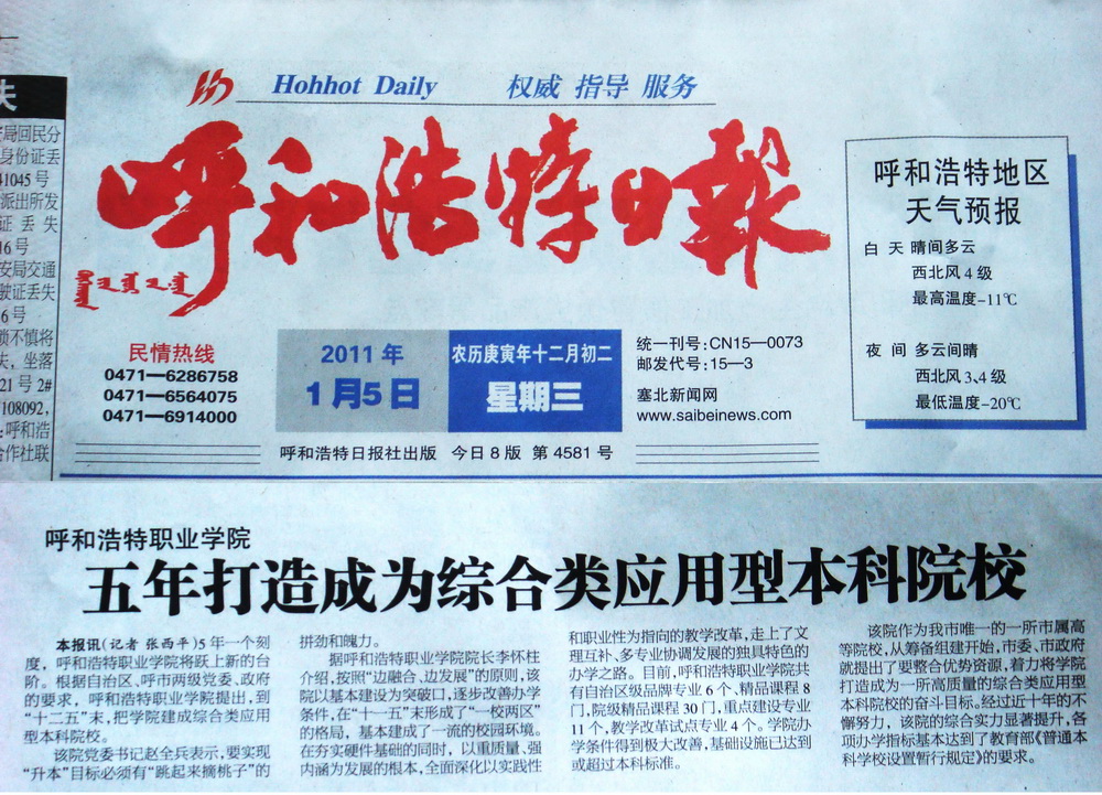 呼和浩特日报:呼和浩特职业学院五年打造成为综合类应用型本科院校