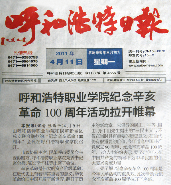呼和浩特日报:呼和浩特职业学院纪念辛亥革命100周年活动拉开帷幕
