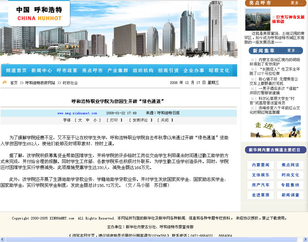 呼和浩特政府网:呼和浩特职业学院为贫困生开辟“绿色通道”