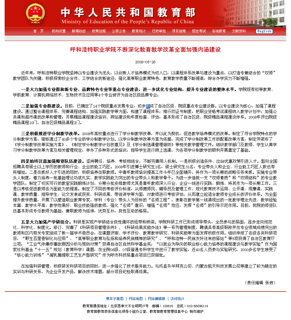 中华人民共和国教育部网:呼和浩特职业学院不断深化教育教学改革全面加强内涵建设