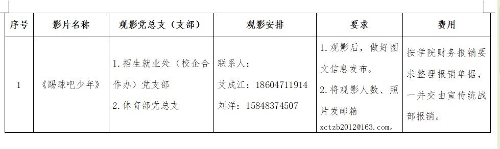 根据呼和浩特市委宣传部《关于组织观看电影<踢球吧少年>的通知》要求,结合学院工作实际,观影活动采取各党总支(支部)轮看形式。请相关部门根据安排及时观影,具体事宜通知如下。