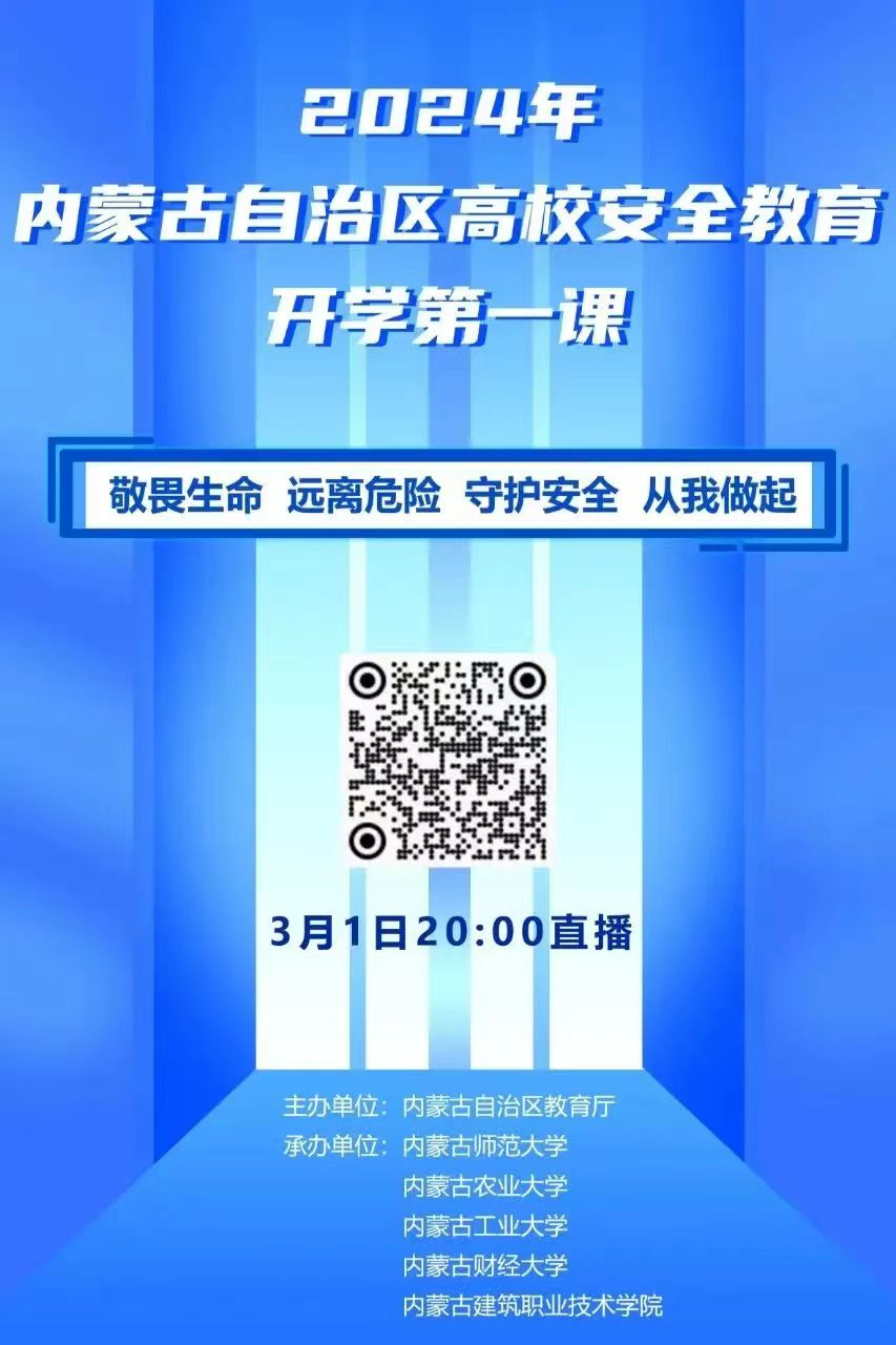 自治区教育厅将于2024年3月1日20:00直播“敬畏生命 远离危险 守护安全 从我做起”主题的2024年春季开学安全第一课。请各系(部)组织全体师生按时扫码观看。
