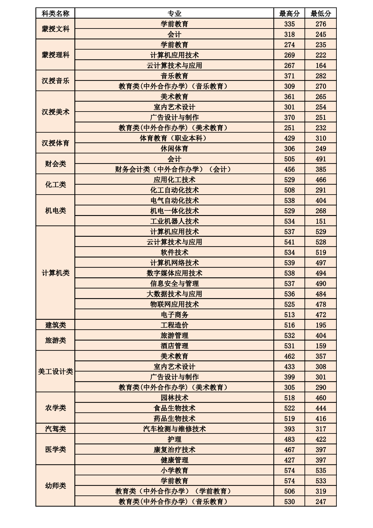 计算机类、农学类、财会类、美工设计类、旅游类、汽驾类、建筑类、机电类、化工类、幼师类的分数线供对口中职生参考。