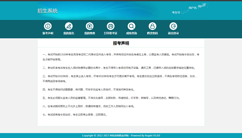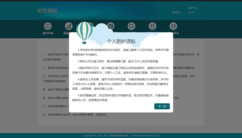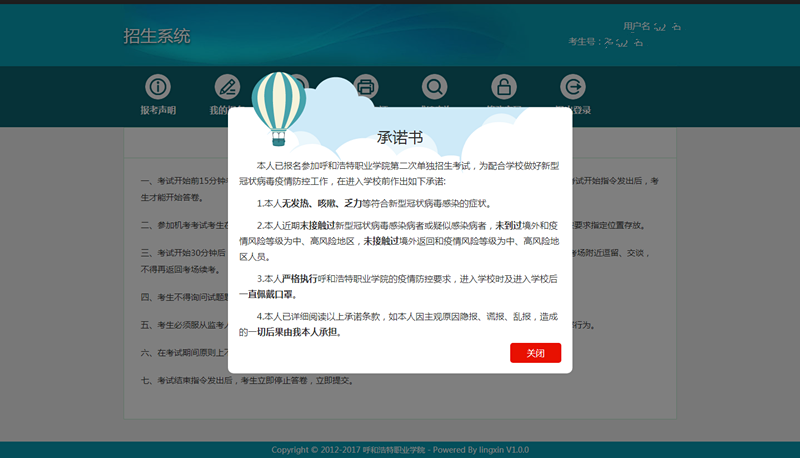 三、登陆后,仔细阅读个人防护须知、承诺书、报考声明。(承诺书需要到学院网站下载打印,考生签字,来校考试时必须携带)