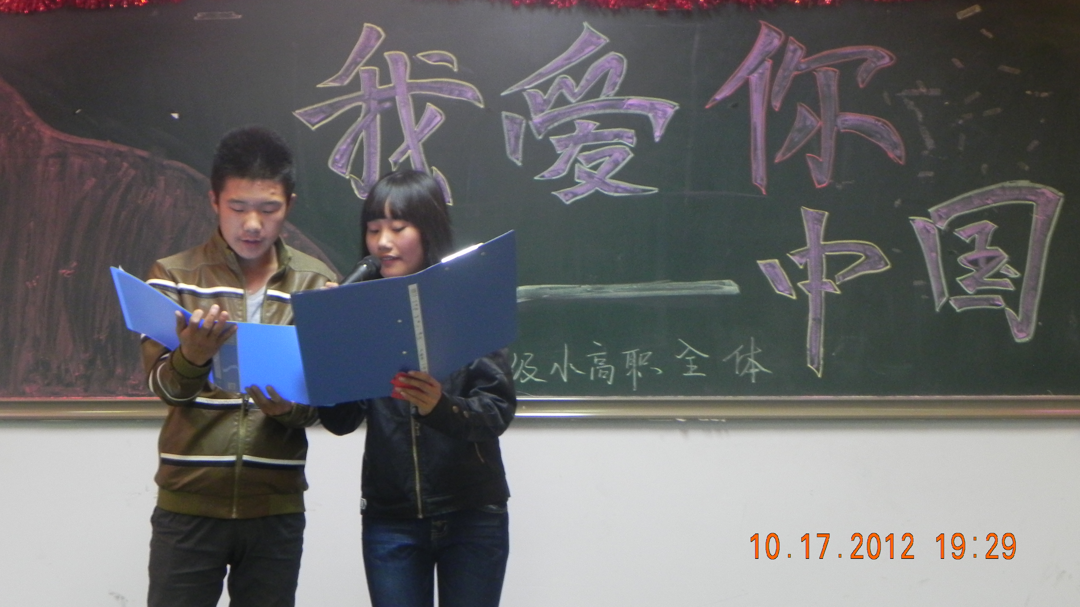2012年10月17日晚,机电工程学院12级小高职在北教学楼109教室举办了以《我爱你,中国》为主题的团日活动,参加本次团日活动的有辅导员白桂平老师及学生会团总支全体学生干部。