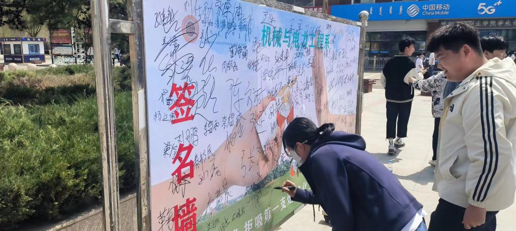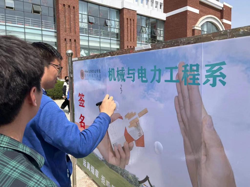 随后,学生代表与教师在签名墙上共同签名,承诺拒绝吸烟,共创无烟校园。