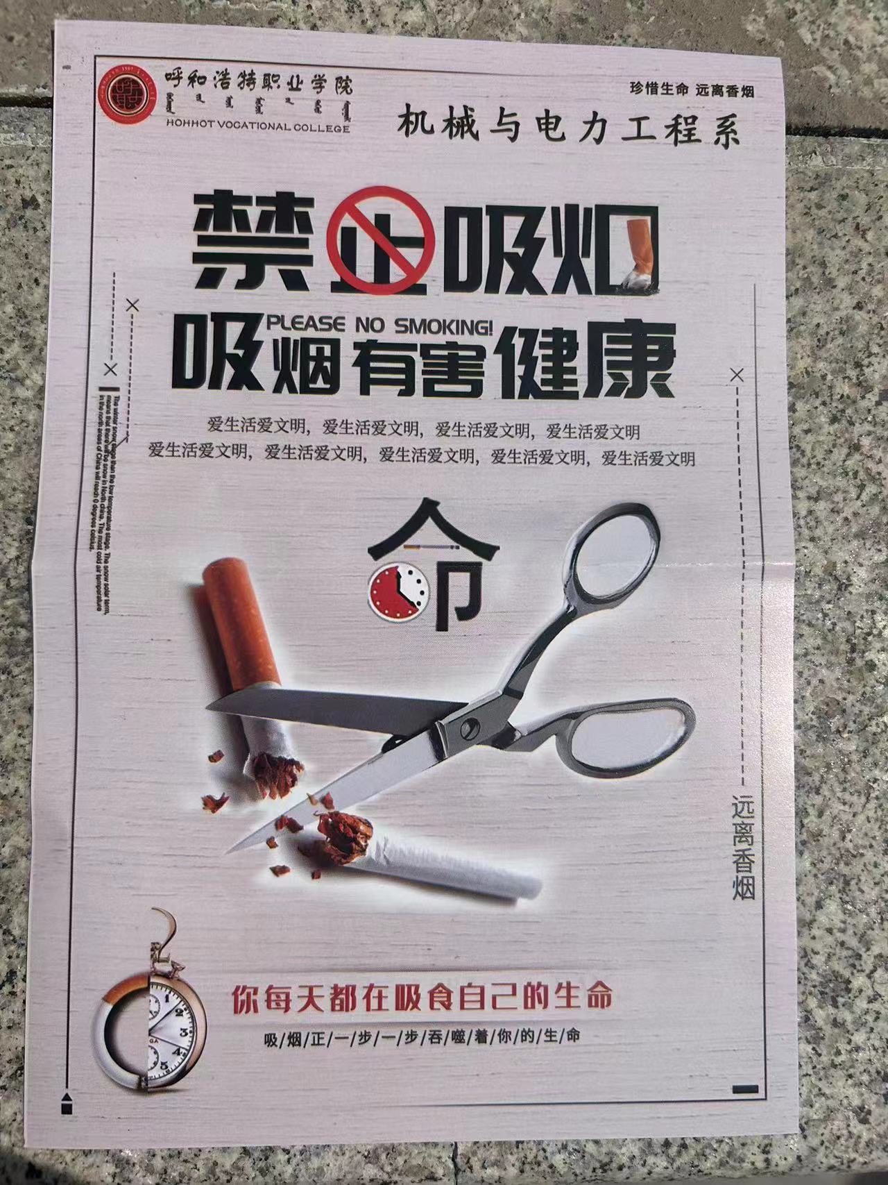 为进一步推进文明校园建设,为我院师生打造无烟、清洁、健康的学习环境,机械与电力工程系于4月19日开展控烟倡议活动,活动由学生科科长张建峰主持,学团科全体专职辅导员及各班级学生代表参加了活动。