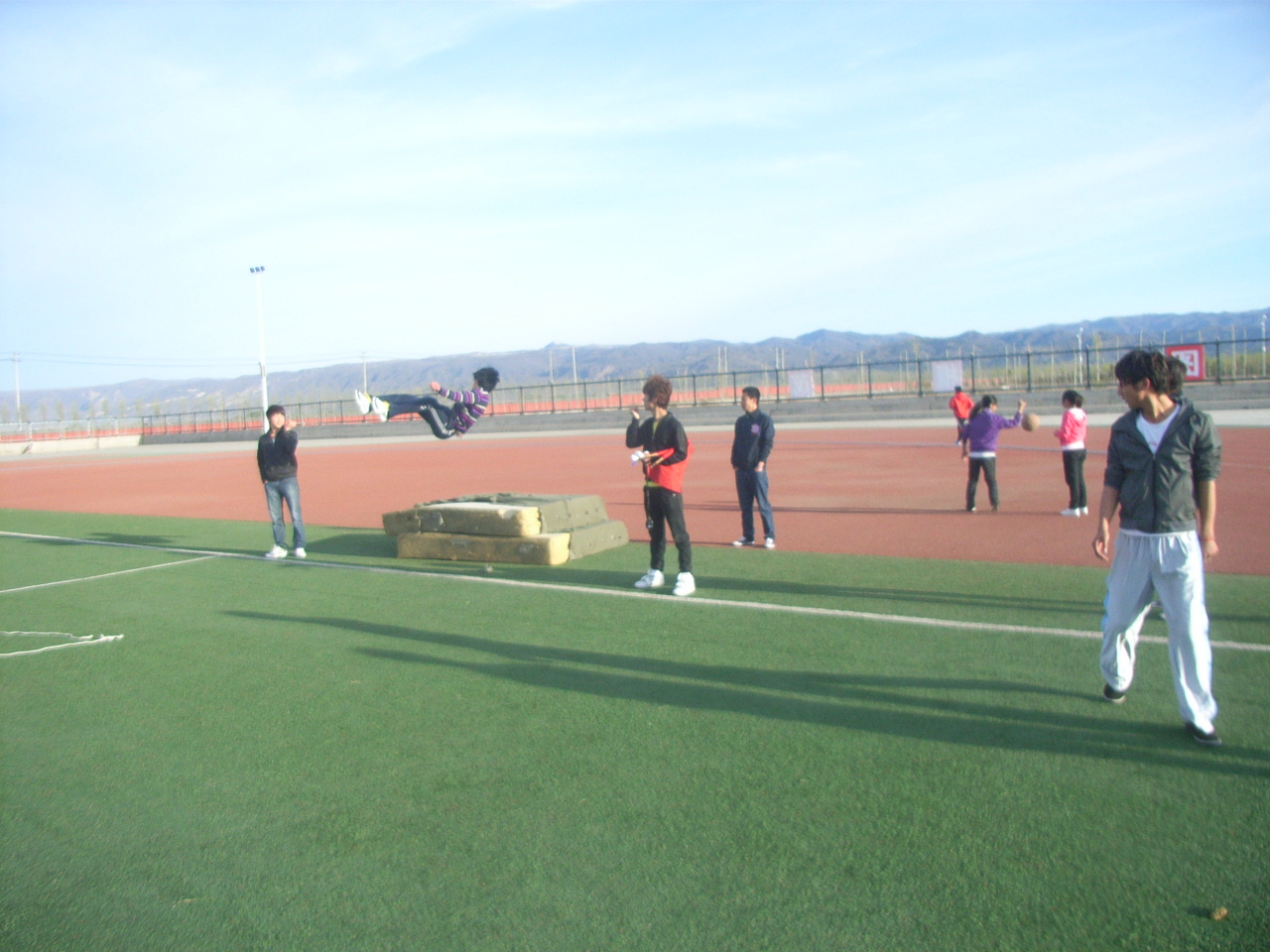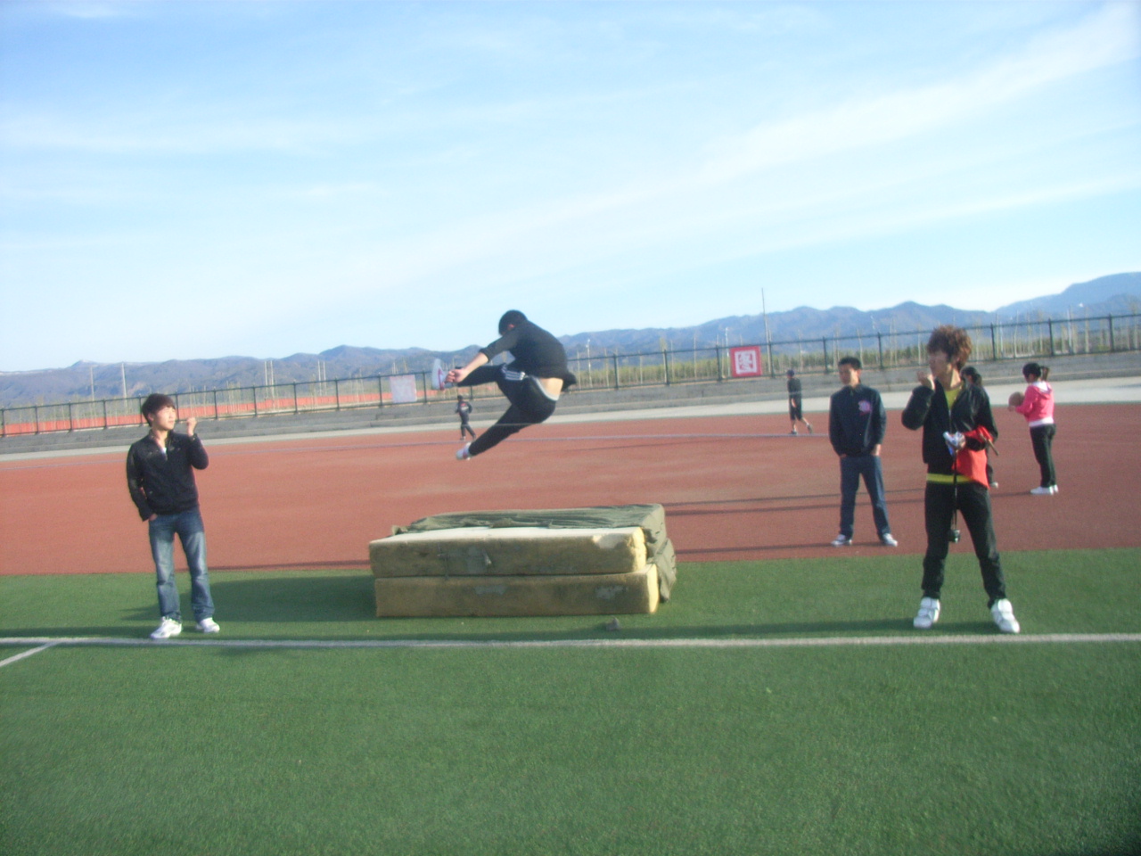 训练现场的运动员们在进行紧张的训练。一次次的跳越,标杆一次次的上升,我们的运动员也在一点点的进步。因为训练,他们满头大汗。但我们仍能看到他们那充满希望的笑容。运动员都纷纷表示以最佳状态迎战运动会。跳出最美的弧线,跳出最好的成绩。为机电工程学院在即将到来的跳高项目增光添彩。