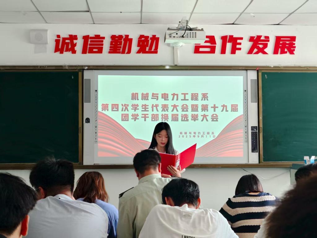 机械与电力工程系第四次学生代表大会暨第十九届团学干部换届选举大会的圆满落幕,不仅实现了团学干部的新旧交替,也进一步凝聚了学生群体的力量。我们坚信,新一届团学干部以更高的责任感,为推动校园建设、服务同学成长贡献更大的力量。