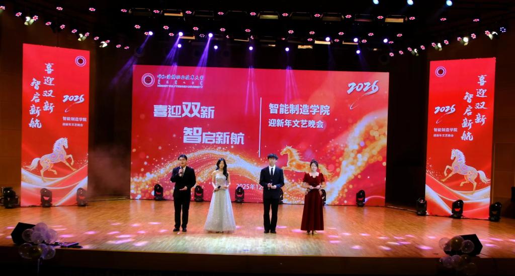 智能制造学院于12月17日晚6:30在鸿雁楼音乐厅举办了“喜迎双新 智启新程”迎新年文艺晚会。校党委副书记白海林、团委书记苏宇、图书馆馆长张国圣亲临现场观看,智能制造学院领导班子成员与全体教职工、学生代表欢聚一堂,共同参与这场辞旧迎新的文化盛会。