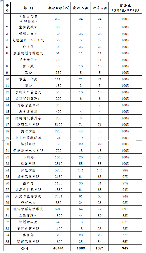 按照呼市红十字会关于做好2020年“博爱一日捐”活动的通知要求,在各基层工会的积极协助和大力宣传下,呼和浩特职业学院2020年度“博爱一日捐”活动现已结束,共募集35个部门、1009名教职工的善款48441元。现将学院2020年度“博爱一日捐”募捐情况公示如下: